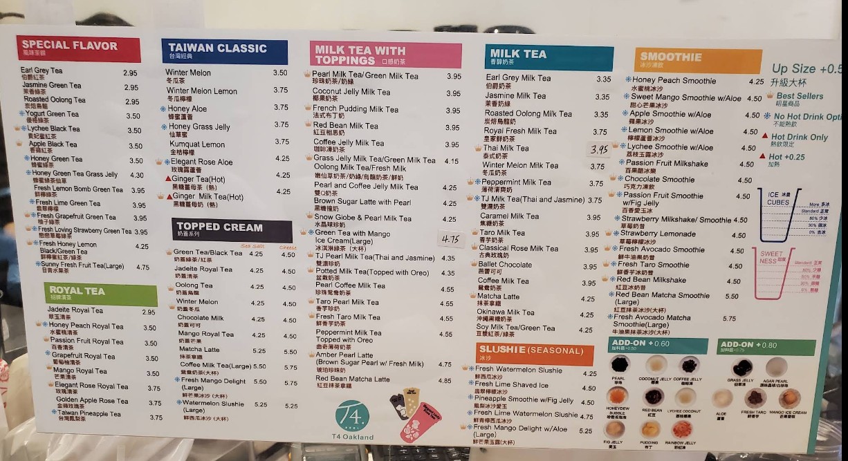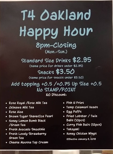 Welcome to T4 Oakland Restaurant, your go-to destination for authentic Taiwanese bubble tea in the heart of Oakland. Our carefully crafted T4 Oakland Restaurant menu features a wide selection of premium milk teas, fruit teas, boba drinks, and refreshing specialty beverages made with high-quality ingredients. Whether you’re stopping by for a quick takeout, enjoying a relaxed dine-in experience, or ordering delivery, T4 Oakland delivers bold flavors, customizable sweetness levels, and the true taste of Taiwan—right on Webster Street.