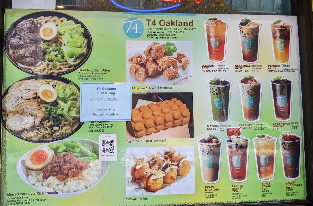 T4 Oakland is a go-to spot for delicious popcorn chicken and tasty milk tea. The flavors are great, and the prices are reasonable. I really appreciate how customizable the drinks are—you can adjust sweetness, ice levels, and toppings to your liking. Highly recommended if you’re craving a solid boba and snack combo!